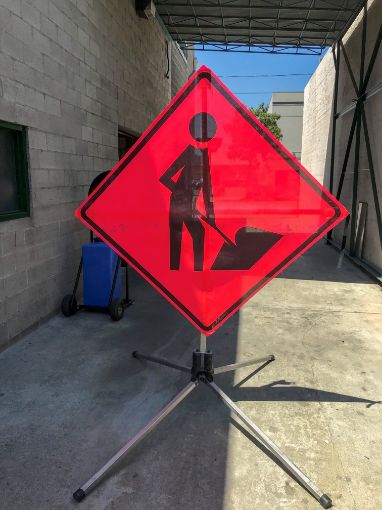 Our road signs are made of heavy duty orange mesh and measure 4’ x 4’ square. All of our signs go out with a stand.